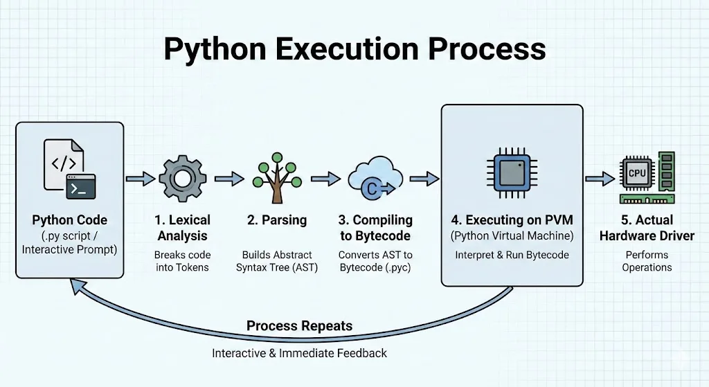 It takes the code and converts it to bytecode and then runs it on a Python virtual machine. The following infographic shows the steps in more detail: